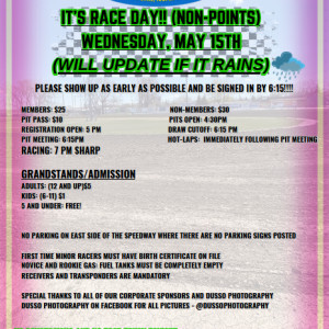 Wednesday, May 15th Race Day Info for this evening! We will update here later today on the status of races tonight if the weather changes accordingly.